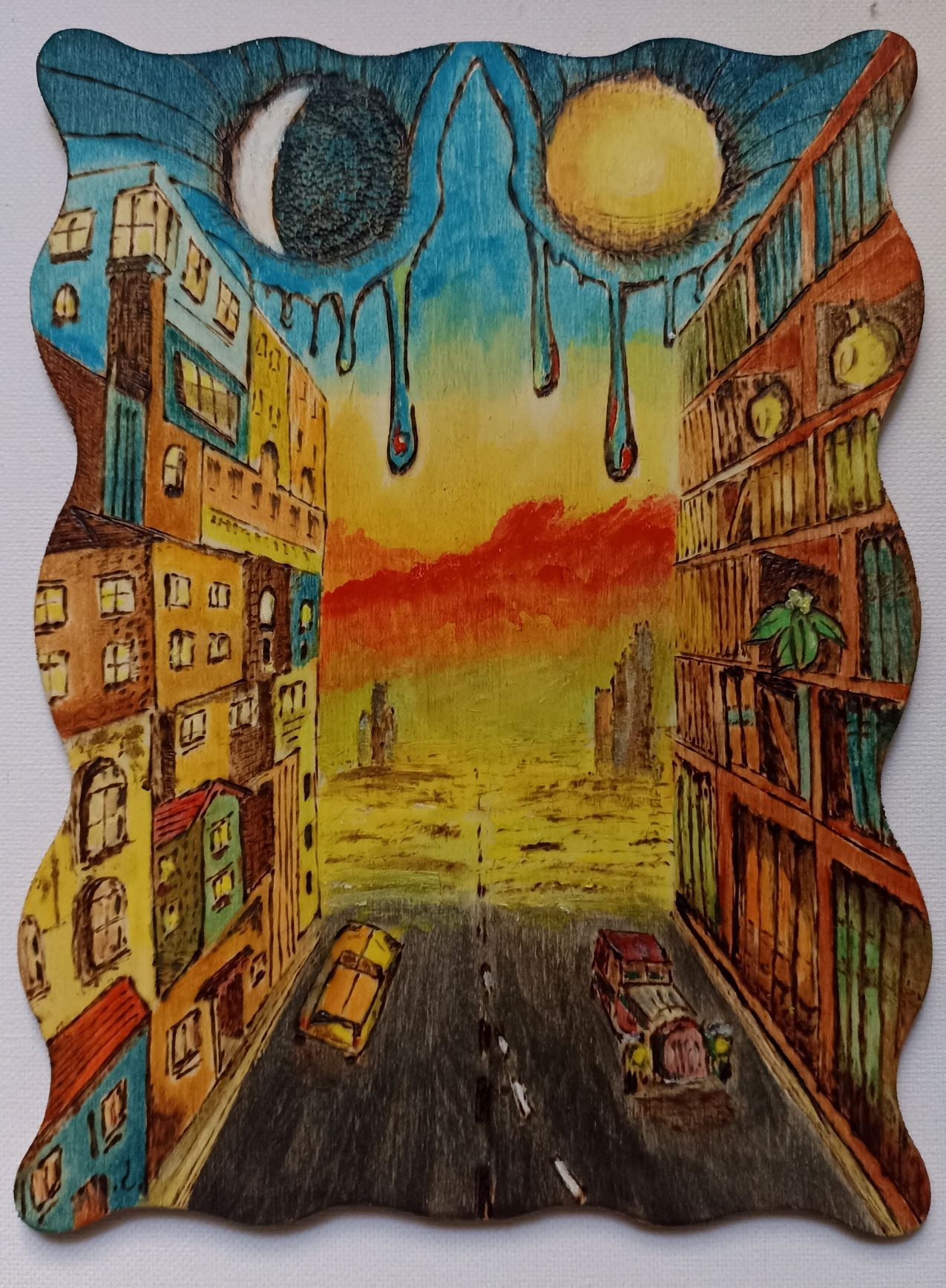 Untitled, 2024, burn-etching and acrylic on wood, 17x23 cm