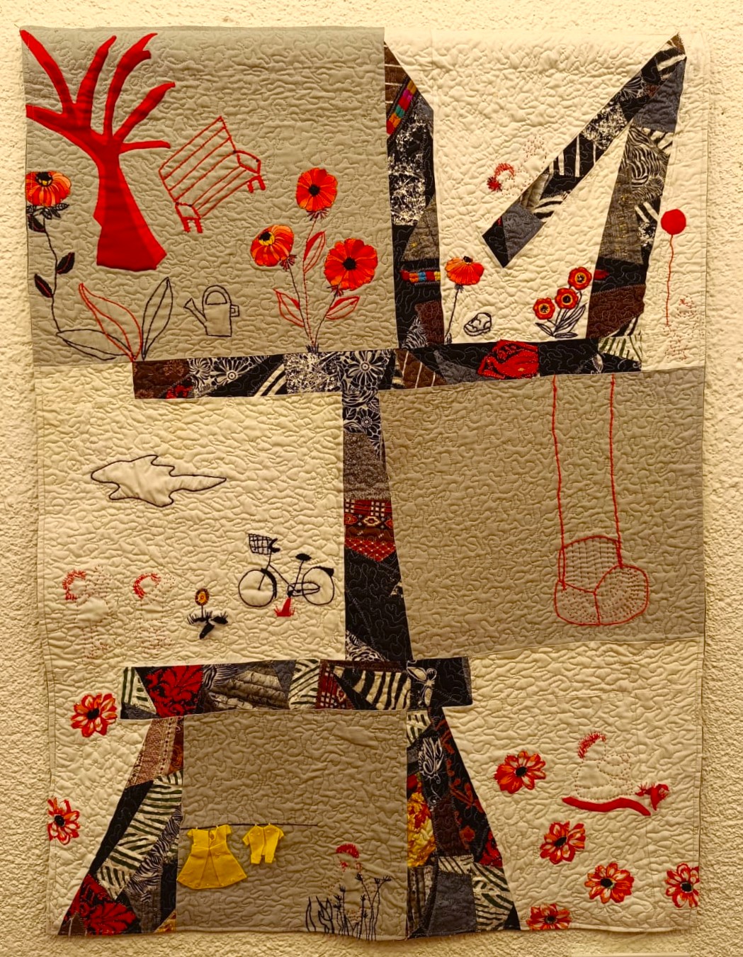 Yochi Dayan (Moshav Dekel), Stunned Silence, 2025, cutting and joining fabrics with a sewing machine, appliqué, fabric dyeing, hand embroidery, fabric origami, and free-motion machine stitching, 107x99 cm