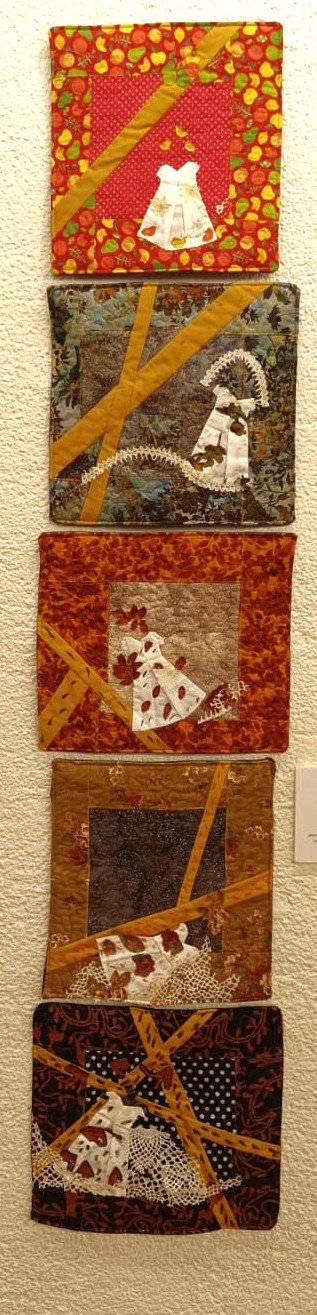 Yochi Dayan, age 80, has lived in Moshav Dekel since its founding in 1982, after being evacuated from the city of Yamit. She holds a bachelor’s degree in agricultural economics and a doctorate in comparative literature. Yochi taught and educated for many years — first at the Kibbutz Yavneh high school, and later in Be’eri and in the Eshkol Regional Council. A textile artist, Yochi combines many techniques in her work: cutting and joining fabrics with a sewing machine, appliqué, fabric dyeing, hand embroidery, fabric origami, and free-motion machine stitching. Her works possess a physical, tactile quality that invites viewers to approach and touch them, as if they were familiar household objects. Indeed, many resemble traditional quilts — delicate yet powerful, personal yet universal. Yochi elevates this traditional female craft, which often lacks full artistic recognition, to the level of fine art through her skilled, confident hand and the emotional depth of each piece. Yochi has been deeply intertwined with the growth and flourishing of Israeli culture, with all its complexity. As a resident of the Gaza Envelope, she lost friends, neighbors, and students in the events of October 7th and witnessed the destruction of her community’s human and cultural fabric — an experience reflected in her work. Her piece “And the Crooked Shall Be Made Straight” was created about a decade before the war and depicts the pioneering development of the region — from sand dunes to thriving agricultural farms. Since the war, many viewers have come to see in it a depiction of chaos and destruction alongside a hope for renewal — a new layer of meaning that emerged through tragedy. In “Stunned Silence,” Yochi expresses the shock and quiet that accompany the still photographs of Be’eri after the loss. The work is dedicated to the young children of the kibbutz whose innocence was violated and who are no longer here. The sturdy foundational pillars of kibbutz ideology come together to form the word “טבח” (“massacre”), dividing the composition into smaller spaces reminiscent of a private courtyard or a corner of a kibbutz. On closer inspection, one discovers signs of loss. In the “What Happened to Chanaleh’s Shabbat Dress?” series, Yochi draws inspiration from the beloved Israeli children’s story centered on acts of kindness and their cultural connection to Judaism. In this series, we see only the dress — not the girl — which leaves us wondering about her fate. Gradually, the dress becomes stained, echoing the fate of mothers in this land. In the final image, the dress hangs on a hanger after the mother’s death. Yochi’s art resonates with the Israeli story — tenderness, pain, resilience, and faith — thread by thread, layer upon layer of life.