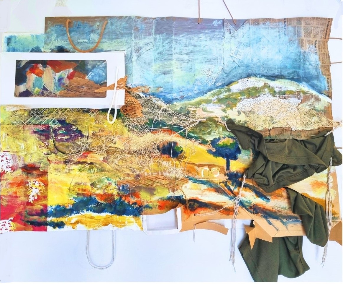 אליה זילברברג (עלי, בנימין), המתנה, 2025, טכניקה מעורבת על שקיות נייר ממותגות, 95x106 ס"מ